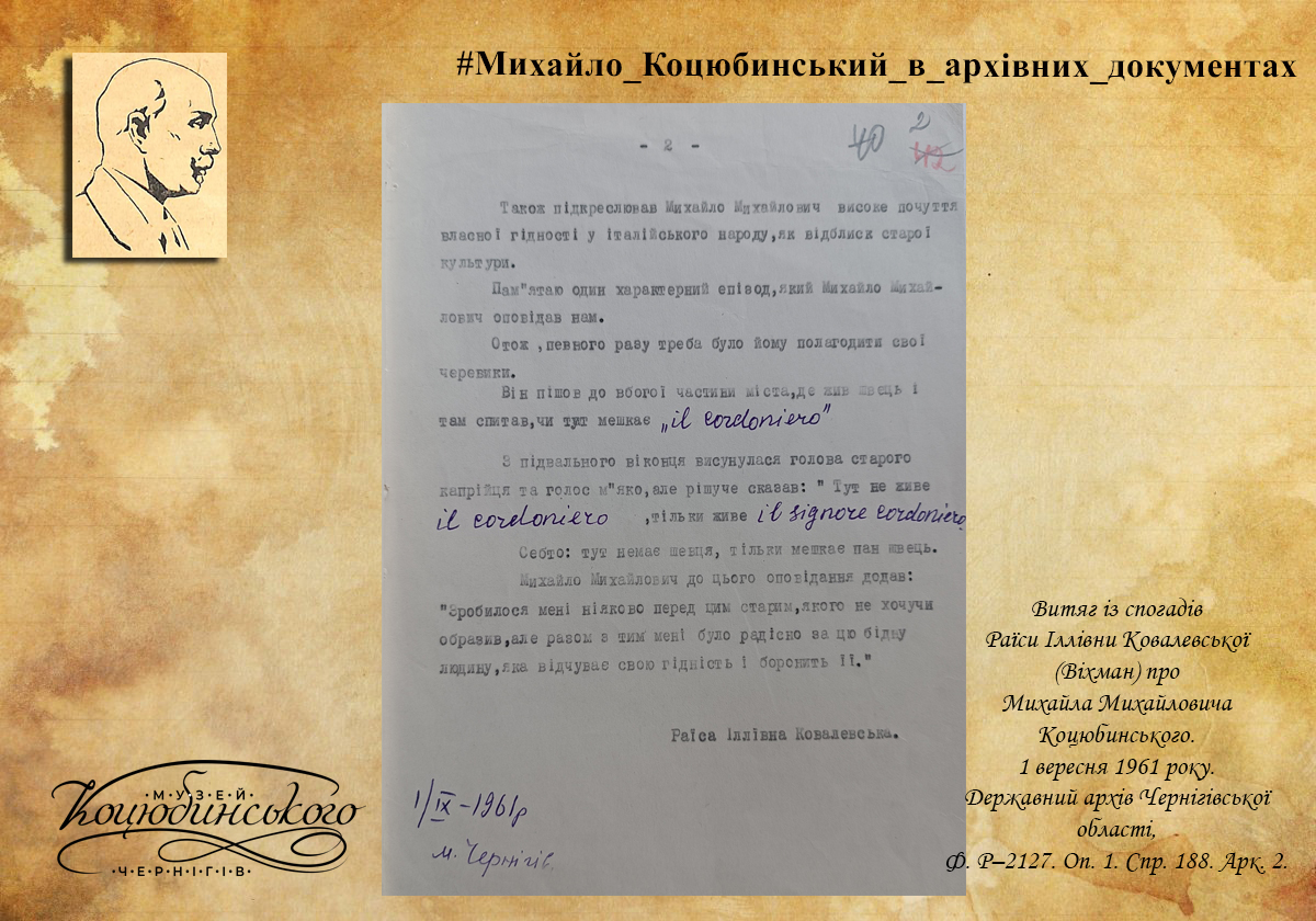 Раїса Іллівна Ковалевська (у дівоцтві Віхман) була пасербицею Іллі Людвиговича Шрага, відомого громадського діяча та адвоката. У своїх спогадах, датованих 1961 роком, вона пише: «Михайло Михайлович Коцюбинський приїздив на свято Іллі до мого вітчима Іллі Людвиговича Шрага у мальовничий Седнів. Одного разу ми з Михайлом Михайловичем пішли на так звану Дякову гору, з якої відкривався чудовий краєвид: хатки з садками, тиха річка, у якій відбивалося небо, широка луговина, далекий ліс».