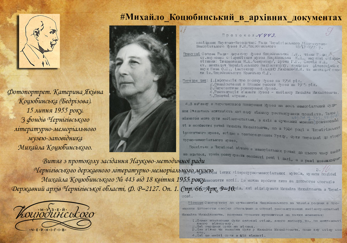 18 квітня 1955 року відбулося засідання Науково-методичної ради Чернігівського державного літературно-меморіального музею Михайла Коцюбинського (колишня назва – Авт.). Голова НМР – директор музею Хома Коцюбинський.