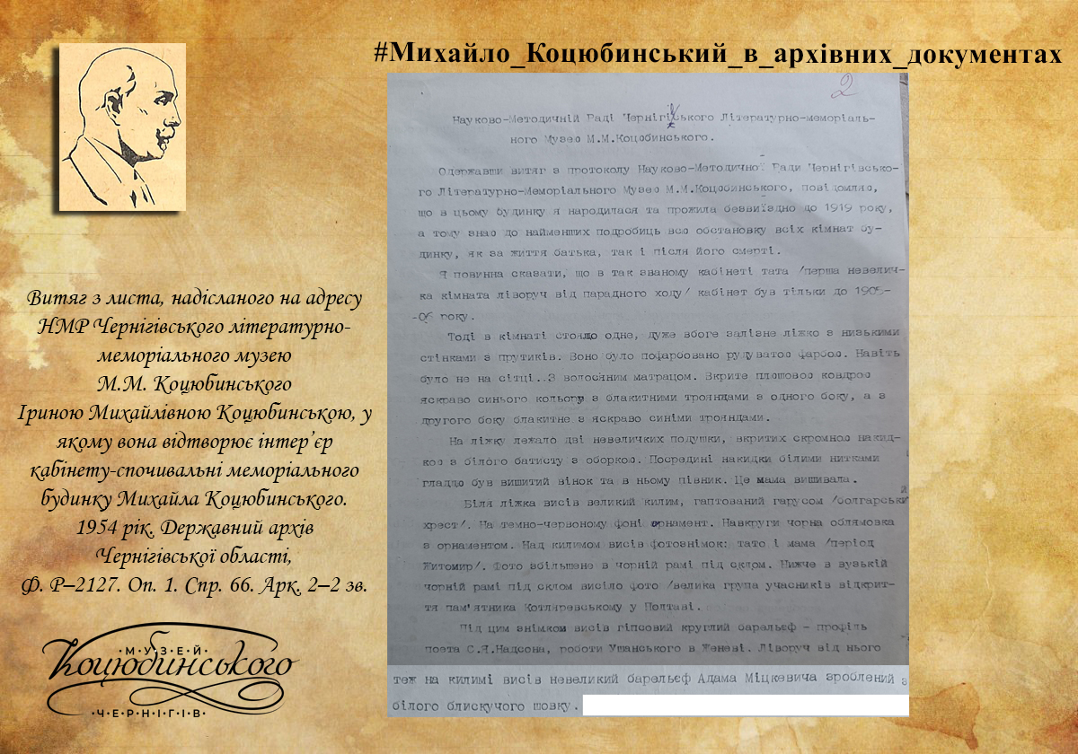 На прохання музею надіслати спогади про інтер’єр кабінету-спочивальні родини Коцюбинських відгукнулася дочка письменника Ірина Михайлівна Коцюбинська. Вона згадувала: «… у цьому будинку я народилася та прожила безвиїзно до 1919 року, а тому знаю до найменших подробиць всю обстановку кімнат будинку, як за життя батька, так і після його смерті. … у так званому кабінеті тата (перша невеличка кімната ліворуч від парадного входу) саме кабінет був тільки до 1905–1906 року.