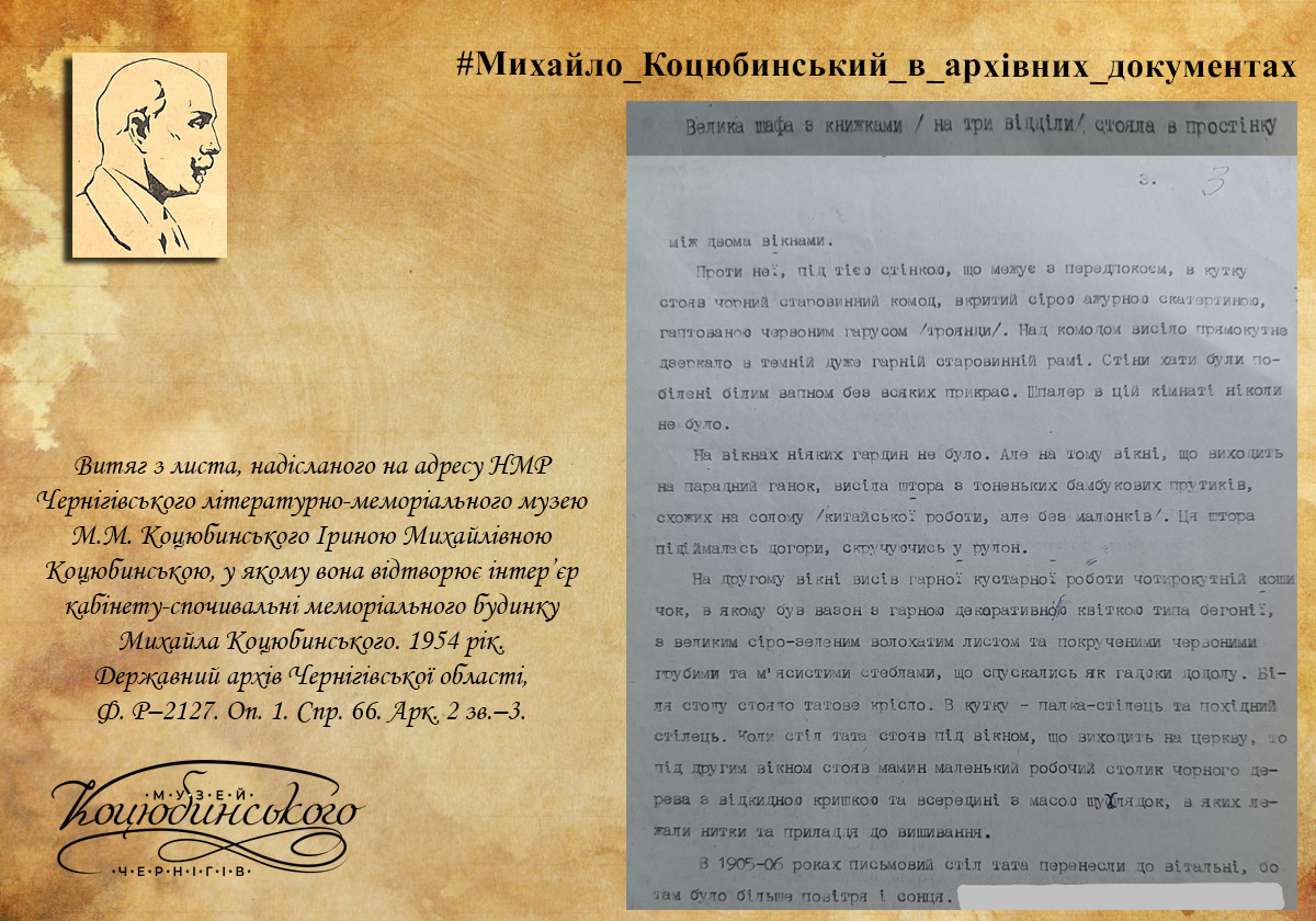 І знову спогади Ірини Михайлівни: «Велика шафа з книгами (на три відділи) стояла у простінку між двома вікнами. Проти неї, під тією стінкою, що межує з передпокоєм, у кутку, стояв чорний старовинний комод, вкритий сірою ажурною скатертиною, гаптованою червоним гарусом (троянди). Над комодом висіло прямокутне дзеркало в темній дуже гарній старовинній рамі. Стіни хати (кімнатні стіни – Авт.) були побілені білим вапном без всяких прикрас. Шпалер в цій кімнаті ніколи не було. Але на тому вікні, що виходить на парадний ганок, висіла штора з тоненьких