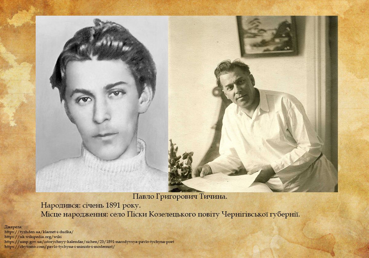 У третій декаді січня (джерела презентують різні дати) 1891 року в с. Піски Козелецького повіту Чернігівської губернії в родині сільського псаломщика (та одночасно вчителя сільської школи грамоти) народився Павло Тичина – майбутній поет, політичний та громадський діяч.