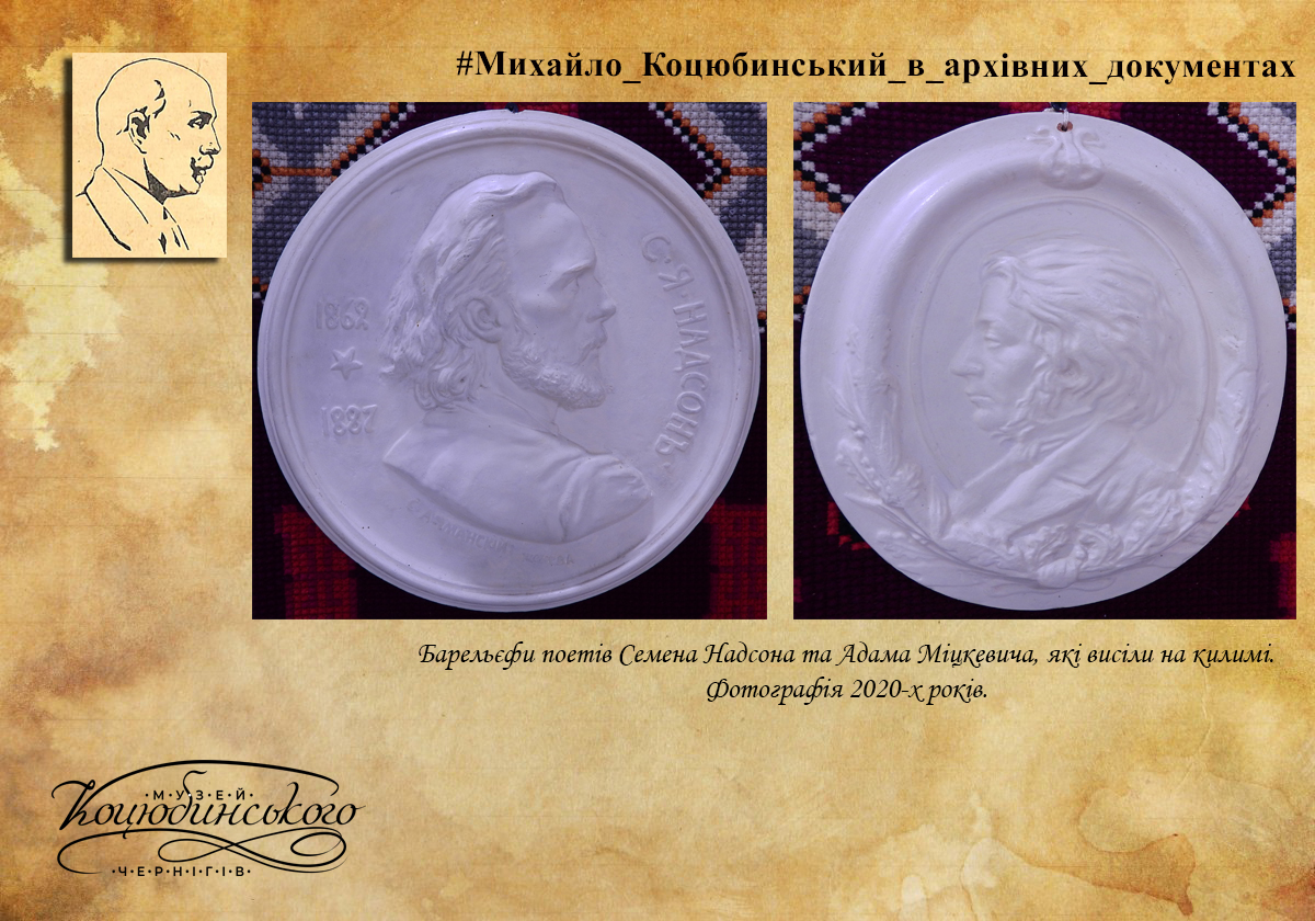 Під цим знімком висів гіпсовий круглий барельєф – профіль поета Семена Надсона. Ліворуч від нього, теж на килимі, висів невеликий барельєф Адама Міцкевича, зроблений з білого блискучого шовку. Просто вирізаний та видавлений профіль без рамки…».
