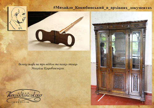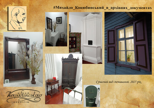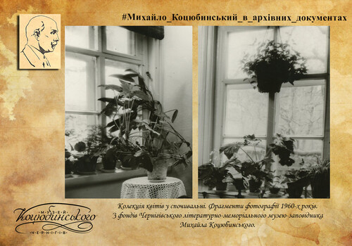На другому вікні висів гарної кустарної роботи чотирикутний кошик, у якому був вазон з гарною декоративною квіткою типу бегонії, з великим сіро-зеленим волохатим листям та покрученими червоними грубими та м’ясистими стеблами, що спускалися як гадюки додолу. Біля столу стояло татове крісло. В кутку – палка-стілець та похідний стілець. Коли стіл тата стояв під вікном, що виходить на церкву, то під другим вікном стояв мамин маленький робочий столик чорного дерева з відкидною кришкою та всередині з масою шухлядок, у яких лежали нитки та приладдя до вишивання. У 1905–1906 роках письмовий стіл тата перенесли до вітальні, бо там було більше повітря і сонця…». Історичний P.S. Сьогодні спочивальня подружжя Коцюбинських є складовою меморіального будинку Михайла Коцюбинського. Побачити її можна, завітавши до Чернігівського літературно-меморіального музею-заповідника Михайла Коцюбинського. Фотофрагменти кімнати додаються до цього повідомлення. Далі буде.