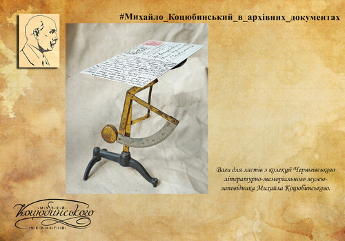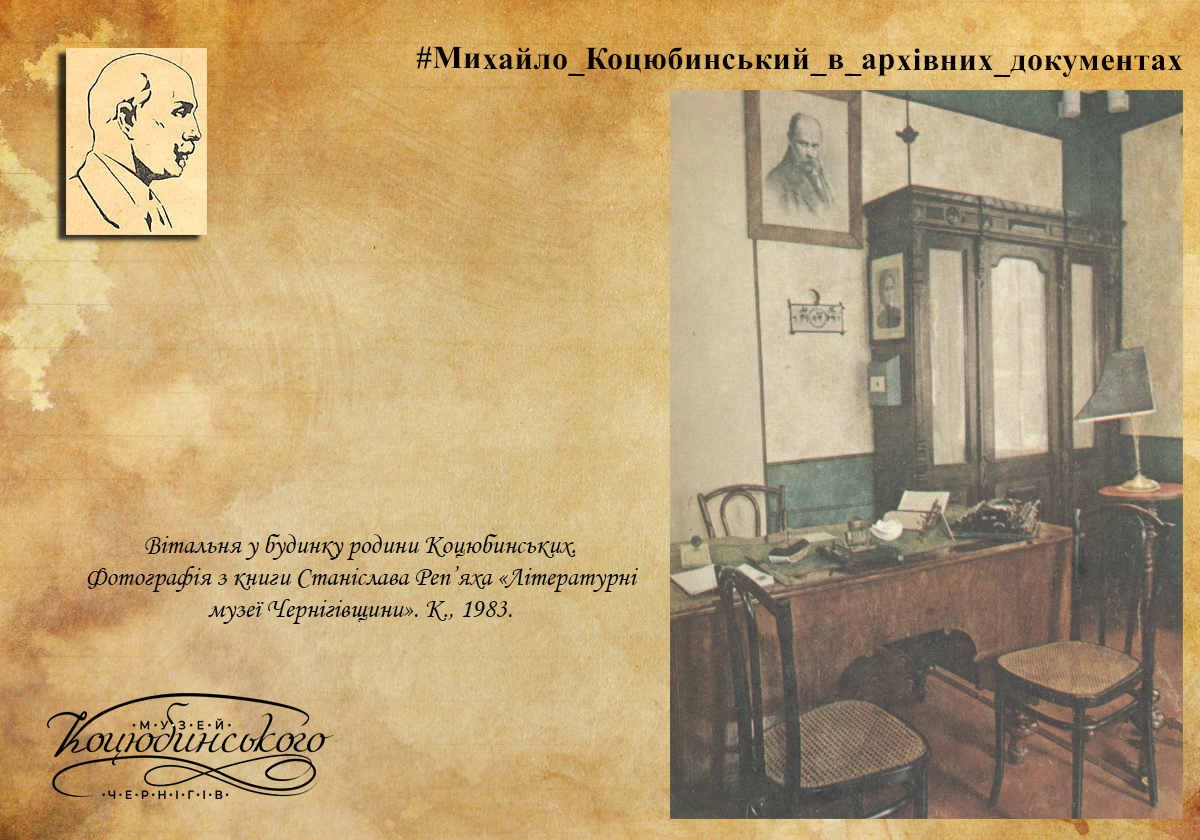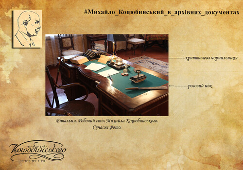 На вікнах висіли тюлеві білі гардини з квітами (маки) на круглих чорного дерева карнизах з круглими шарами по боках. Над татовим столом висів портрет Т.Г. Шевченка, сепія у простій білій дубовій рамі, під склом, роботи О. Дегтлера (О. Дегтяря – Авт.). Поряд з письмовим столом у кутку стояла велика шафа з книжками (на три відділи). На боці цієї шафи, що підходила під лівий бік столу, висів мамин портрет (мама курсистка, з стриженим волоссям, у темній закритій сукні). Фото 24X30 у вузенькій чорній рамі. Під портретом висіла поштова скринька, зроблена з темно-зеленого картону з намальованим листом. У цій скрині були відділи для поштового паперу, для конвертів та для марок. На письмовому столі тата стояли такі речі: чорнильниця, спочатку сіра мармурова з веслами та матросом… а пізніше – квадратова чорного мармуру дошка. На ній одна велика чорнильниця з кришталю. Бронзова кришка. Роговий ніж. Грубий, невеликого розміру енциклопедичний словник з ілюстраціями у темно-червоній обгортці. Невеличкі, з білого металу терези для зважування листів та бандеролей». Далі буде.