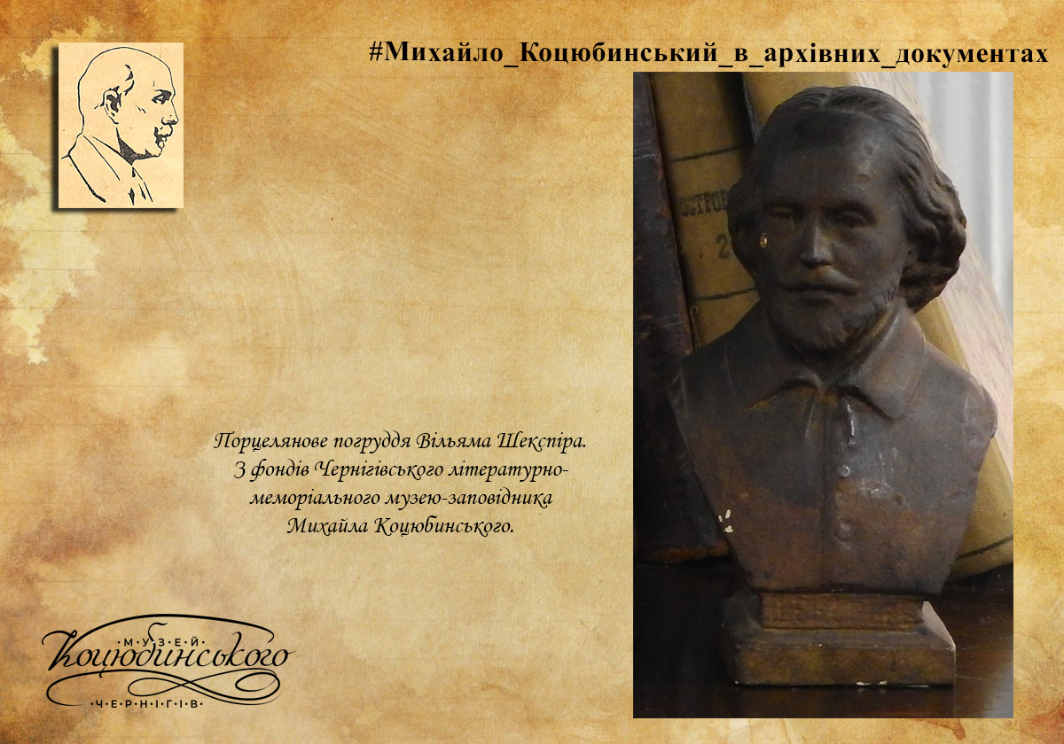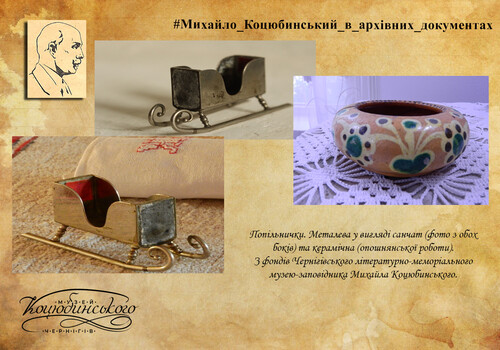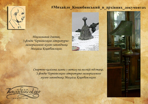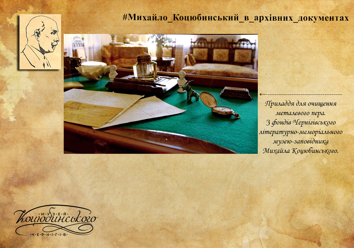 На чорнильниці стояв маленький овальний портрет тата в мідній тонкій рамці під склом. Тато там знятий ще хлопчиком. Тут же стояло маленьке порцелянове погруддя Шекспіра. Приладдя для чищення пер. Мармурове сіре преспапьє. Попільниця – металеві санчата. Друга – опошнянської роботи. Третя – куля з дерева. Нікельований дзвоник з шестерневим механізмом. Коробочка карельської берези у вигляді кашкета. Дві лупи. Одна більша, друга менша. Перламутрові зелені скойки від мушлів. Одна чиста з обох боків, а друга обросла з зовнішнього боку дрібними мушлями та морським намулом. На столі стоїть спиртово-калільна лампа з металу на довгій підставці. На цій палиці можна було лампу підіймати вище, чи спускати. Лампа під залізним зеленим чотирикутним абажуром, з різним склом та спеціальною сіточкою, що світилась сліпучим світлом, коли її засвічували. На столі у тата лежав стопками поштовий папір з портретом Т.Г. Шевченка. Під столом стояв плетений з лози кошичок для паперу. Праворуч від письмового столу по другий бік вхідних дверей під стіною стояла ще одна книжкова шафа (вона є в музеї). У вітальні під лівим першим вікном біля великої шафи стояла велика пальма на високій підставці з чорного дерева…». Далі буде.
