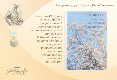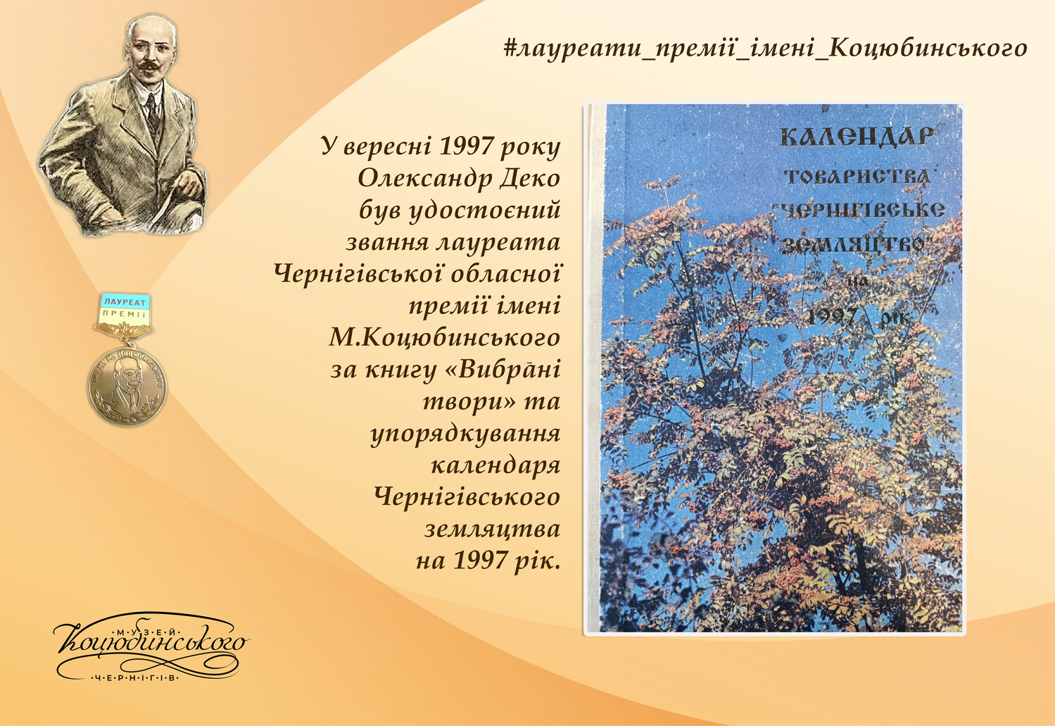 Лауреат Міжнародної премії «Тріумф» Олександр Деко у вересні 1997 року був удостоєний звання Чернігівської обласної премії імені Михайла Коцюбинського за книгу «Вибрані твори» та упорядкування календаря Чернігівського земляцтва на 1997 рік.