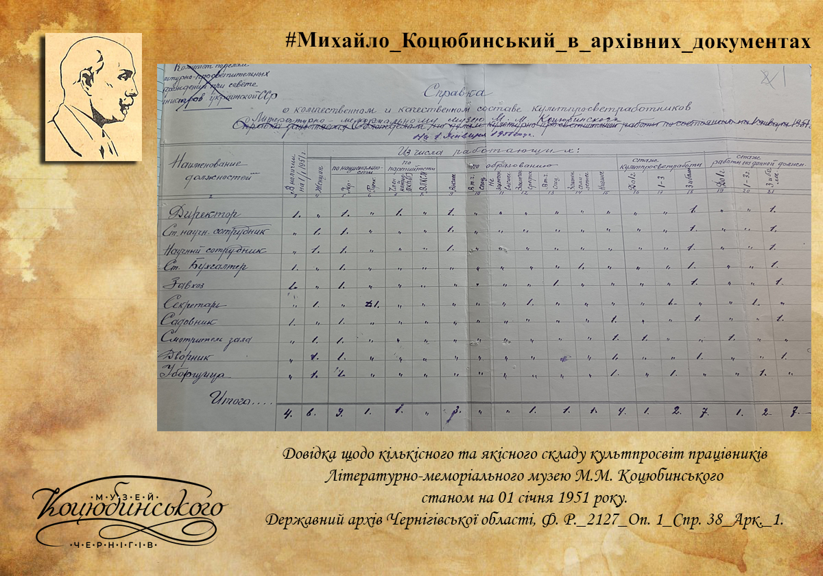Гідне функціонування музею взагалі та музею Михайла Коцюбинського зокрема неможливе без колективу однодумців. Формувався він поступово (починаючи з 1936 року), поступово ж збільшувався. Довідка 1951 року щодо кількісного та якісного складу культпросвіт працівників Літературно-меморіального музею М.М. Коцюбинського (Державний архів Чернігівської області, Ф. Р._2127_Оп. 1_Спр. 38_Арк._2) засвідчує, що штатний розпис передбачав 10 посад: директор, старший науковий співробітник, науковий співробітник, старший бухгалтер, завгосп, секретар, садівник, доглядач, двірник, прибиральниця.