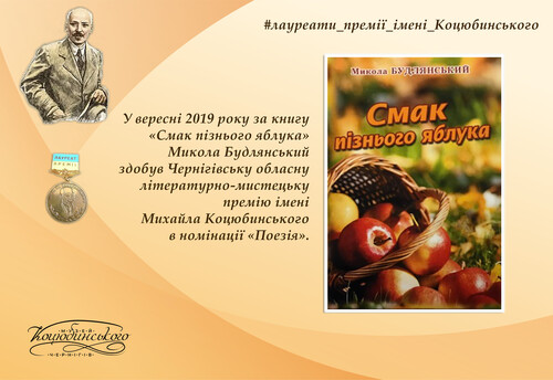 Один із віршів Миколи Будлянського присвячений Сонцепоклонникові Михайлу Коцюбинському: Біля могили Михайла і Віри Коцюбинських Запліта ніч косу неспішно. Ніч – натхненна пора поетів. На горі, де чатує вічність, Ходять тіні забутих предків. А вони он з гори під руки, Геть забувши про час і втому, Через жовту, як сум розлуку Із домівки ідуть додому. Устеляють тумани стежку, Устеляють тумани місто. – Ой, Михайлику, обережно, З гори стежка крута й горбиста! Завтра знову твоя Субота, Завтра буде звучати Слово. …Червоніються спілим глодом Зорі їм у вінках любові. Прийде завтра знов небо синє І поети із творчим звітом, І дівчинка в легкій хустині… Може, звати її Харитя. Тут і сонце ходу спиняє (Він йому поклонявся низько). Світе добрий, ти мало знаєш Що за сила – наш Коцюбинський! Лауреат всеукраїнських і міжнародних премій Микола Будлянський у вересні 2019 року здобув Чернігівську обласну премію в номінації «Поезія» за збірку «Смак пізнього яблука».